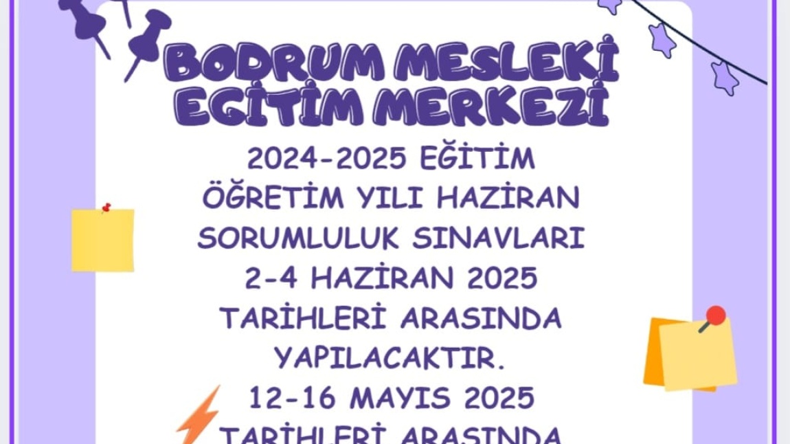 2024-2025 Eğitim Öğretim yılı haziran sorumluluk sınavları 2-4 haziran 2025 tarihleri arasında yapılacaktır. 12-16 Mayıs tarihlerinde okula gelerek başvuru yapmanız gerekmektedir.
